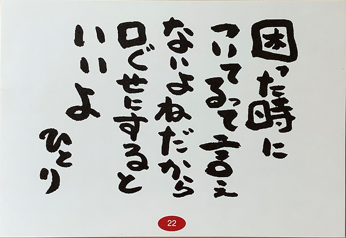 「困ったことがおきたら 面白いことがおきた と言ってみな 奇跡が起きるから ひとり」