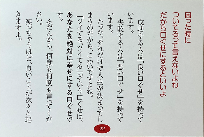 とりあえず、どんなときも「ツイてる」って、口癖にしておいて、楽しく生きよう!って思います。